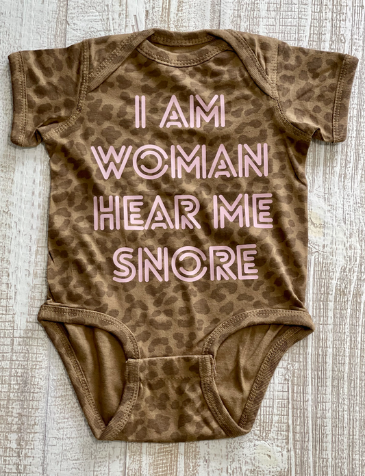 I Am Woman, Hear Me Snore Onesie - Leopard/Pink